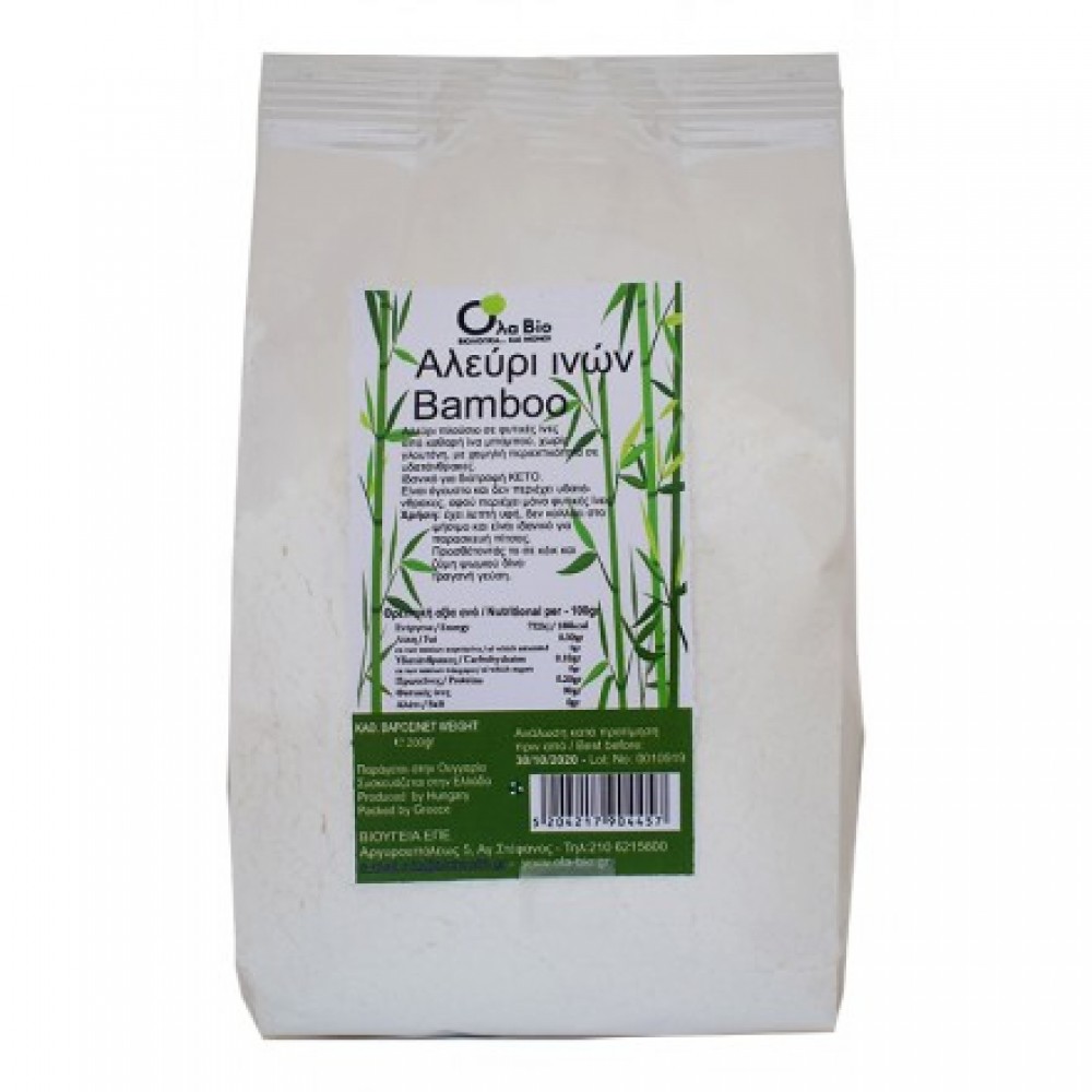 Αλεύρι πλούσιο σε φυτικές ίνες από καθαρή ίνα μπαμπού, με χαμηλή περιεκτικότητα σε υδατάνθρακες. Οι βλαστοί μπαμπού από τους οποίους προέρχεται το αλεύρι, έχουν υψηλή περιεκτικότητα σε φυτικές ίνες, πρωτεΐνες, βιταμίνες και ανόργανα άλατα, ενώ έχουν χαμηλή περιεκτικότητα σε λίπος και ζάχαρη. Είναι ιδανικό για διατροφή ΚΕΤΟ ΝΤΟΥΚΑΝ και κατάλληλο για διαβητικούς, αθλητές και άτομα που κάνουν δίαιτα. Είναι άγευστο και δεν περιέχει υδατάνθρακες, αφού περιέχει μόνο φυτικές ίνες.Χρήση: έχει λεπτή υφή, δεν κολλάει στο ψήσιμο είναι ιδανικό για παρασκευή πίτσας και μπορείτε να το προσθέσετε σε αρτοσκευάσματα όπως κέικ, καθώς και σε ζύμη ψωμιού, δίνοντας μία τραγανή γεύση.