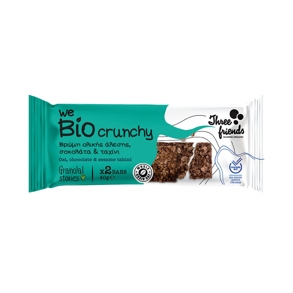 Τραγανές μπάρες δημητριακών, με βρώμη ολικής άλεσης, από εκλεκτά συστατικά βιολογικής γεωργίας με σοκολάτα και ταχίνι.