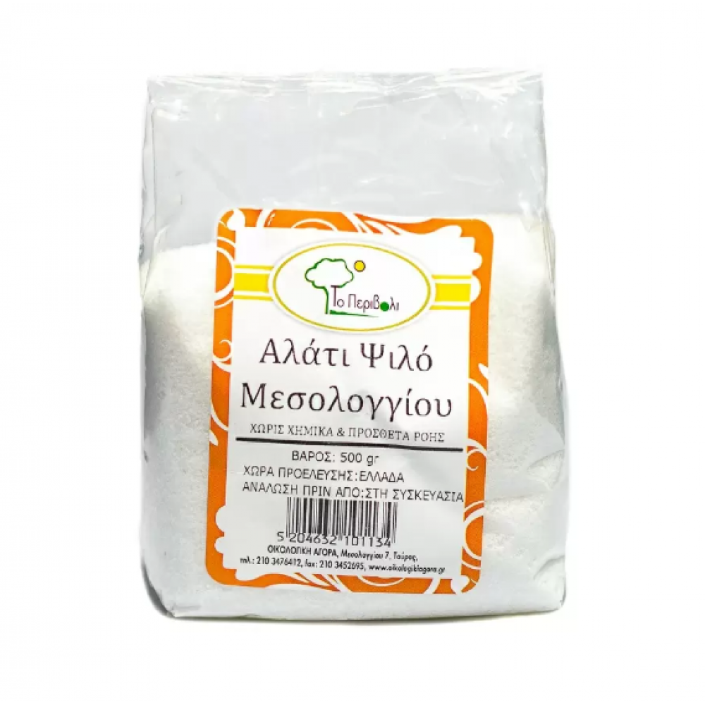 Αλάτι ψιλό Μεσολογγίου της εταιρίας το Περιβόλι. Το θαλασσινό αλάτι είναι πηγή ορυκτών και 60 ιχνοστοιχείων τα οποία εξακολουθούν να είναι άφθονα ακόμα στις θάλασσες. Με την κατανάλωση θαλασσινού αλατιού, διασφαλίζουμε ότι διατηρούμε επαρκή τα επίπεδα νατρίου. Αυτό βοηθά στην εξισορρόπηση των αναλογιών νατρίου-καλίου. Το νάτριο και το κάλιο είναι δύο ηλεκτρολύτες που συνεργάζονται για να εξασφαλίσουν ότι υπάρχει σωστή ισορροπία υγρών στα κύτταρα του σώματός μας. Η ελάχιστη επεξεργασία του αλατιού, του επιτρέπει να διατηρεί μεγάλο μέρος του φυσικού ορυκτού περιεχομένου του. Η θάλασσα μπορεί να περιέχει πολλούς από τους κύριους ηλεκτρολύτες. Το νάτριο, το μαγνήσιο, το ασβέστιο και το κάλιο, είναι απολύτως απαραίτητα για την καλή υγεία. Ως πάροχος νατρίου, το θαλασσινό αλάτι είναι απαραίτητο και για τη σωστή λειτουργία του εγκεφάλου, των μυών και του νευρικού συστήματος.